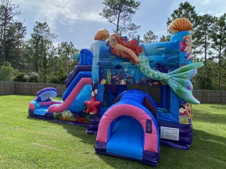 Mermaid Wet Combo Unit — Transform your backyard into a sparkly undersea playground with this colorful inflatable combo. Designed for splashy summer fun, it combines a roomy bounce area, a crawl-through tunnel entrance, and an internal climb wall that leads to a 6-foot waterslide finishing in a shallow splash pad — perfect for cooling off energetic kids. Bright mermaid artwork, seashell and starfish accents, and an ocean-themed color palette make it an instant centerpiece for mermaid, beach, or princess parties. An interior basketball hoop adds extra play value, and the covered bounce zone gives little swimmers a shady spot between slides. Available with wet or dry setup options; choose Wet to enjoy the full water-slide experience. Easy to match with party décor and well suited for birthdays, daycare events, and neighborhood gatherings. Manufacturer: Leisure.