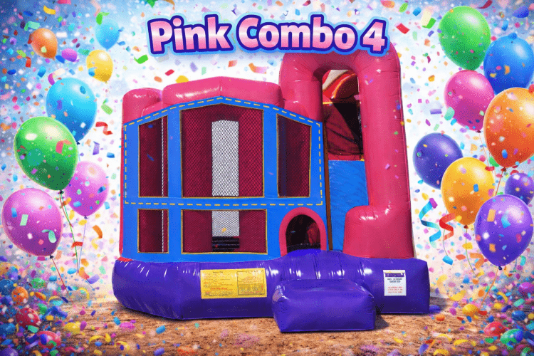 Pink Combo 4 — A lively pink-and-purple 4-in-1 combo inflatable that turns any backyard or event into a centerpiece of bouncing fun. At roughly 15 ft by 18 ft, this all-in-one unit offers about 270 sq ft of play space with a roomy bounce area, an interior basketball goal for active play, a climbing ramp, and an attached slide for fast, safe exits. Mesh windows on all sides give parents a clear 360-degree view of the action while keeping kids contained and ventilated. Designed for guests ages 3 and up, it’s ideal for girls’ birthday parties, family gatherings, school events, or community celebrations. Choose from an Add‑A‑Theme panel (over 50 options available) to personalize the front with popular characters like Trolls, Moana, Frozen, Paw Patrol, Minions, Star Wars, and more. Durable, colorful, and built for hours of supervised bouncing and sliding entertainment.