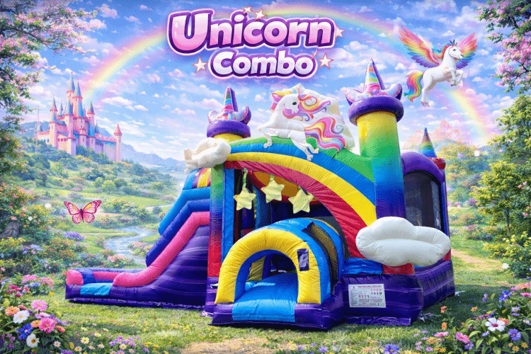 Bring a little magic to your party with this vibrant Unicorn Wet Combo Unit — a colorful, all-in-one inflatable that combines bouncing, climbing, sliding and splashing for nonstop fun. Kids enter through an arched tunnel into a roomy bounce area, challenge a climb wall to reach a 6-foot wet slide, and zoom down into a splash pad landing pool for a refreshing finish. Additional play features include an interior basketball hoop for friendly competition and a small crawl-through tunnel for extra adventure. Bright unicorn graphics, rainbows and cloud accents make it a showstopper at birthday parties, backyard celebrations, or any event where kids want active, wet-play excitement. Offered as a wet OR dry setup; choose wet to enjoy the waterslide and splash landing.