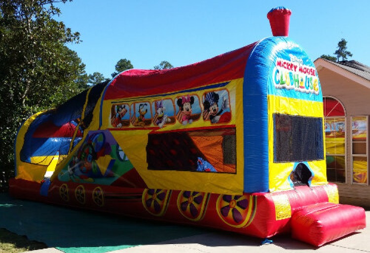 Mickey's Choo Choo 3-in-1 combo will bring smiles to children's faces. Kids can bounce the day away, climb up the steps, and ride down the slide. It features licensed Disney artwork and the a very roomy slide. It can be used wet or dry... simply attach the supplied misting hose to your garden hose and instantly convert it into a very cool water slide!