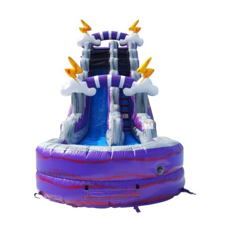 Turn up the fun with the 20 Ft Thunder Water Slide — a towering, double-lane inflatable built to deliver big thrills and cool splashes for backyard birthdays, block parties, or any summer celebration. Standing 20 feet tall and stretching 37 feet long, this eye-catching slide features a safe, secure climb with handholds and step ladder, dual sliding lanes for friendly racing, and a cushioned splash pool at the bottom for a refreshing finish. Constructed for heavy use and routine sanitization before every rental, it includes the blower, extension cord, and ground stakes you need for setup. Recommended occupancy follows standard safety guidelines: multiple kids of similar size on the bounce area or one rider per slide at a time. You’ll need enough clear space for installation, a standard electrical outlet within about 50 feet, and a hose and water source for wet use. Perfect for kids, teens, and adventurous adults looking to beat the heat, this dramatic purple-and-gray waterslide makes a bold centerpiece that rents quickly during warm months — book early to secure your splashy highlight.