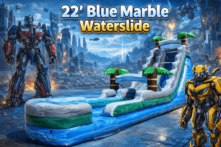 Take a tropical escape to your party with this 22-foot Blue Marble Tropical Slide — a tall, eye-catching inflatable slide that sends riders racing down a sweeping, water-ready lane into a cushioned splash pool. Designed for thrill and safety, it features textured sidewalls and raised bumpers to keep riders on course, a climbing area with handholds and barriers for secure ascent, and a wide slide surface that gives a smooth, fast ride every time. The vivid blue, green, and gray “marble” colors plus palm-tree accents make it a standout centerpiece for backyard parties, school events, or summertime celebrations. Ideal for older kids and teens who want a big, wet-and-wild attraction, it packs dramatic height and a long run for maximum fun without taking over a giant yard.